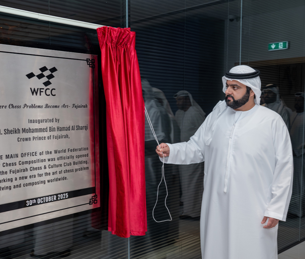 On 30 October 2025, a solemn opening ceremony was held to mark the inauguration of the WFCC office in the magnificent new home of the Fujairah Chess & Culture Club (FCCC). The office, located within the splendid three-storey chess palace, was officially opened by H.H. Sheikh Mohamed bin Hamad Al Sharqi, Crown Prince of Fujairah.
